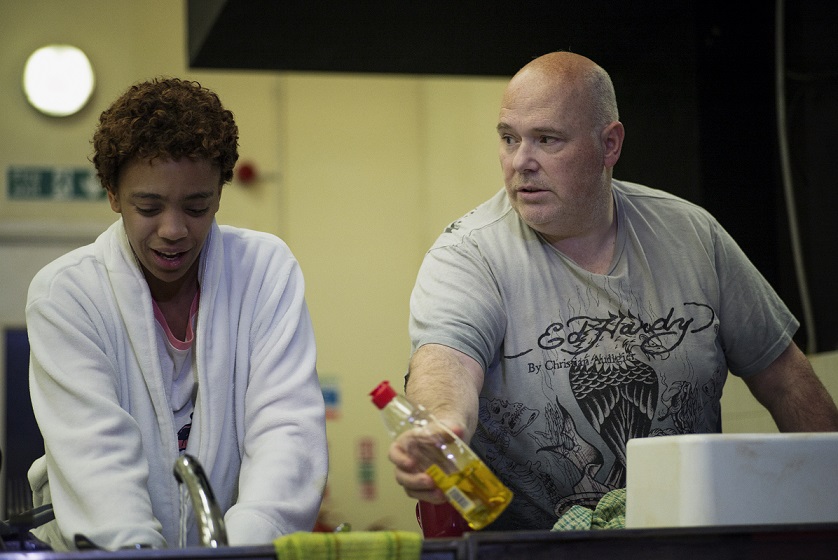If that sounds in any way abstract, the world we see in Love is as concrete and grounded in contemporary British reality as it could be – in the deeply, shamefullly depressing reality of welfare cuts that in this decade have driven a not-so-small part of the population to the edge, taking away so much human dignity in the process. The play’s single space is an anonymous kitchen-cum-lounge in a shared temporary accommodation hostel, with tables, a few chairs, the soulless furniture of waiting-rooms; behind it numbered doors open into the rooms, while off to one side is the bathroom that everyone has to share (queuing for the toilet, or getting there first, is an issue in itself). There’s the proverbial theatrical kitchen sink, of course, which doubles for one of the play’s tenderest moments, a fridge – each shelf someone’s particular domain – a kettle and a toaster.