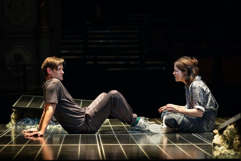 A nameless man and woman – young, wholesome, metropolitan – are queuing in Ikea when he drops the baby-bomb: should they get pregnant? “It’s like you’ve just punched me in the face and then asked me a maths question,” she gasps, blind-sided – and indeed everything about both play and production has a mathematical precision. Rob Howell’s set is a gridded platform that resembles graph paper, disrupted at the corners by glittering bedrock and overhung by scorching lights. On it, Foy and Smith – dressed almost like children themselves, she in dungarees, he in baggy trousers and T-shirt – engage in jittery conversational debate about love, sex, family, and the pros and cons of bringing a child into a world we’re destroying.