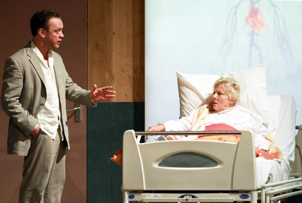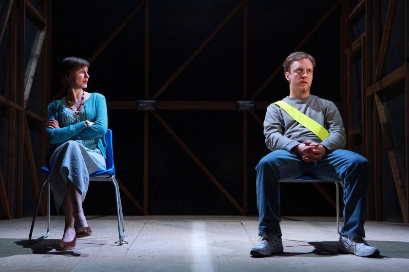 All of these have been performed by a company of 14 actors — including Anna Calder-Marshall (pictured below with Sam Troughton in Hnath’s Death Tax), Siobhan Redmond, Paul Bhattacharjee and Jonjo O’Neill (last seen in Lucy Prebble’s The Effect). In the case of Mint, the cast includes Troughton, Laura Elphinstone and Debbie Chazen. As a new play, it’s a studio piece that looks a bit lost on the main stage, but its writing does have an undeniable power.
