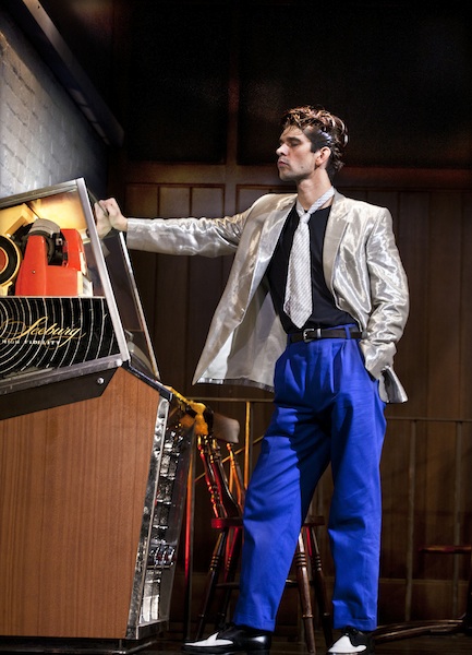 It takes place entirely in a Soho club, one which is jumping on the bandwagon of the fledgling music revolution. The play opens in the upstairs office, where silver-suited and suitably quiffed singer Silver Johnny (Tom Rhys Harries) is fine-tuning his strut before going on stage. We can hear the pulsating music below, sense the excitement of his teeny audience; when he rushes down the stairs, the lights go out and the volume’s racked up, the play launches like a take-off at Houston.