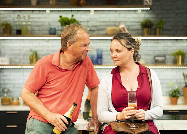 Having said all this, director Alastair Whatley does make a good stab – a knife is produced at the start of the play, and in typical Chekhovian fashion does its worst at the climax – at delivering an enjoyable evening, screwing up the tension as the characters get screwed up. Designer James Perkins has created a perfect celebrity kitchen, and the play is well cast: Janie Dee is always watchable, and excels as the bemused and self-regarding Caroline, although I was never convinced that she was either a celebrity chef or a Christian. More convincing are Patrick Ryecart and Charlie Brooks (pictured above) as Mike and Sally, Ryecart’s facial grimaces a lesson in comic grotesquerie. Genevieve Gaunt’s stoned Amanda, Jack Sandle’s stolid Graeme Jack Archer’s sensitive Leo are all fine.