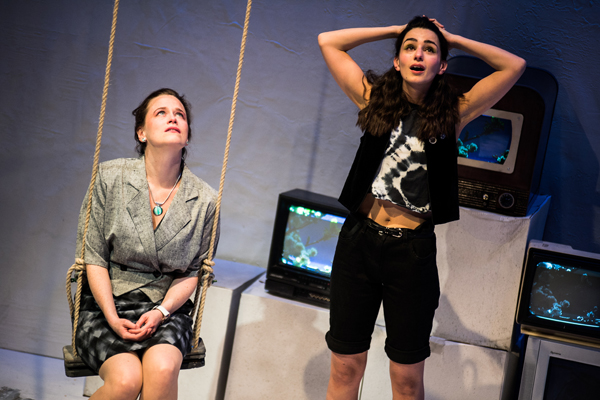 Paul Robinson’s production is a bit scrappy and a bit too shrill for my taste, although his cast hit all the right buttons when emotional depth matters. Maureen Lipman (Doris) turns in a quiet scene-stealing performance, being dry, wry and showing off her consummate sense of comic timing. Caroline Faber (Margaret) explores the mix of pathos and resentment in her character, while Katie Brayben and Serena Manteghi (as Jackie and Rosie, pictured above) show how family feelings echo down the generations. Signe Beckmann’s abstract set, with its video projections of historical context by Timothy Bird, allows the play to develop fluidly, even if the waste ground scenes are not very convincing. But the most moving passages work well, and it’s easy to conclude that this show is a winner.