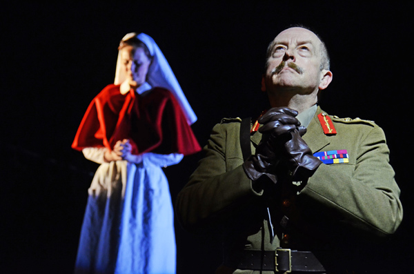 Occasionally, this production achieves this longed-for kind of emotional power: a lone voice heard across No Man’s Land sings “Stille Nacht”; British Tommies intone “We are Fred Karno's Army” or simply “We’re here because we’re here because we're here...”; a Belgian officer softly complains of his country being abandoned by the Allies. At other moments, a single shell blast reminds us of the shocks of war; nurses in bright red capes tend the injured; a leg sticks out of a mound of earth. And General Haig (pictured above) comes across, unfairly or not, as a rigid religious fanatic.