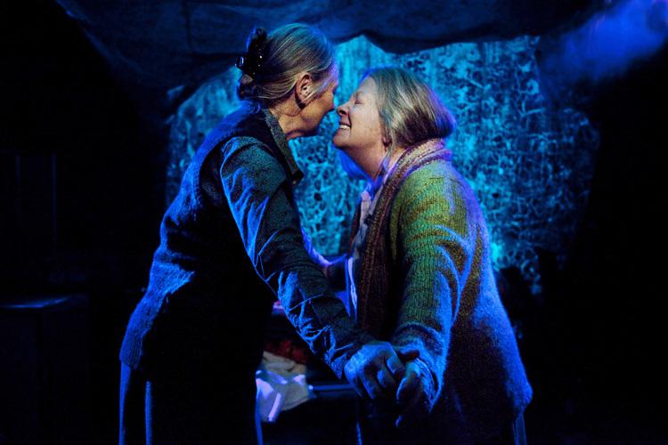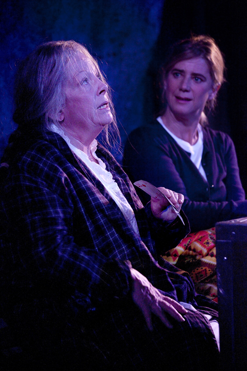 The indignity of dementia takes form by turns horrifying and heartbreaking in Calder-Marshall’s Iola (pictured right, with Stubbs as Menna). Disarming us initially with eccentricity (a mobile phone meets a watery end in the teapot) and biddable absent-mindedness, Calder-Marshall’s carefully controlled subsiding into desperation is no less tragic for all its ugliness. Vomit spews forth unbidden from her, and language only a little less foul breaks into her dealings with her beloved family.