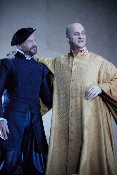 Compared to Shaw’s bravura performance, the rest of the cast seem rather tame. Jamie Ballard’s Carpeta is rather mild and whiny; Tim McInnerny’s Doge is dignified and suave (pictured right, with his arm around Robert Hands's Suffici). None of the others are memorable. It's really Shaw's show. By the second half of the evening, Tom Cairns’s production seems to get bogged down in some lagoon, and begins to meander. Because of Hildegard Bechtler’s design, whose reds and yellows evoke Venice, it looks good, but lacks pace and intensity.