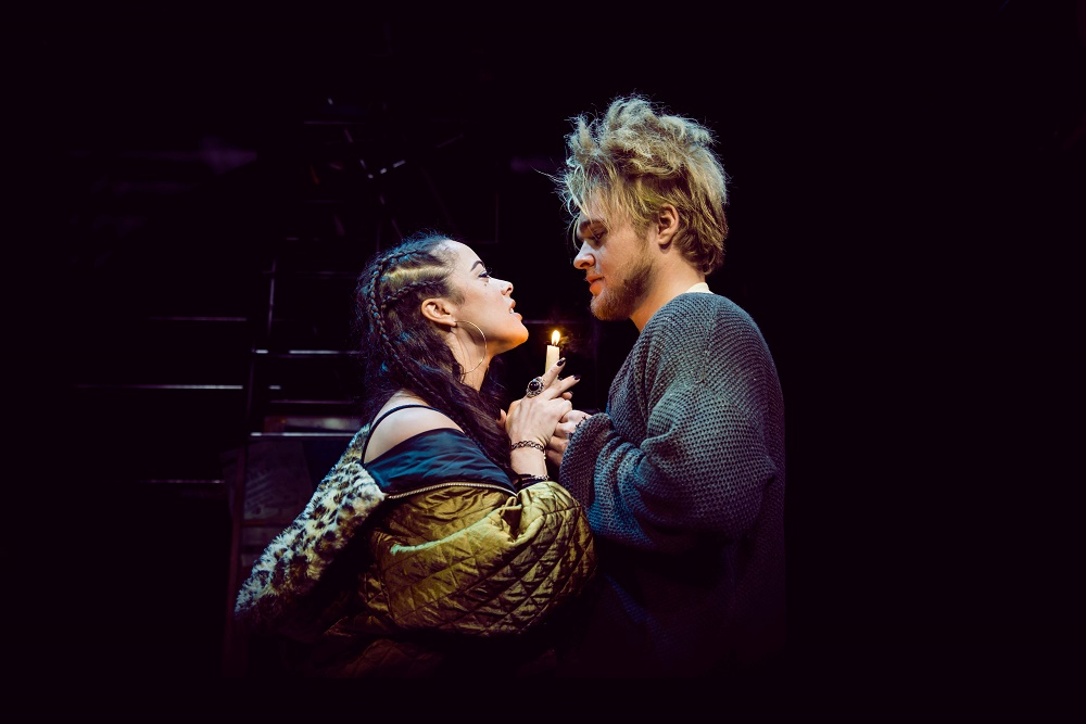 Beyond the odd death, and sundry lovers' tiffs, there's not much to the plot. If Larson had had his way it would have been much more gooey and self-congratulatory than it actually is. He once said to a roommate, "Did you know that this ZIP code has the second highest AIDS rate in the country?" Mimi and Roger break into romantic song when their bleepers go off at the same time, reminding them to take their AZT. (Pictured below: Philippa Stefani as Mimi and Ross Hunter as Roger)