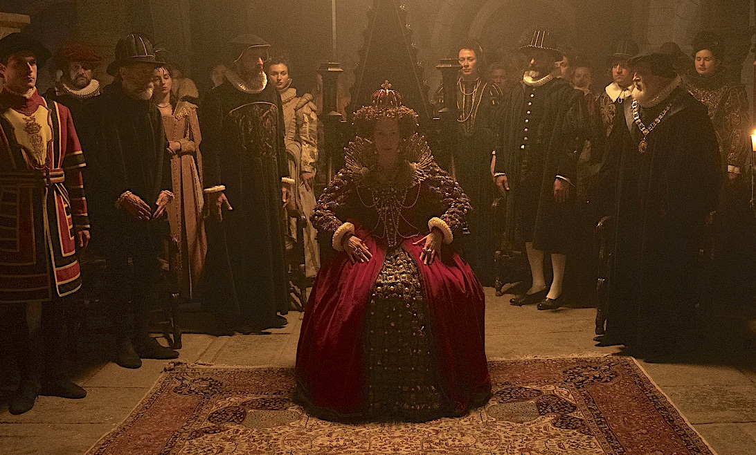 This one-note performance especially grates in the scenes with his wife and family, largely abandoned if well looked after financially in the rural Midlands, while the head of the household hobnobs around town with Kit Marlowe and the Monarch (pictured above, Petra Lippai-Horváth as Elizabeth I with her court). One longs for the grist of David Mitchell’s earthy cynicism in Upstart Crow, Ben Elton’s comedy series that shares some elements of this production’s underpinning premise.