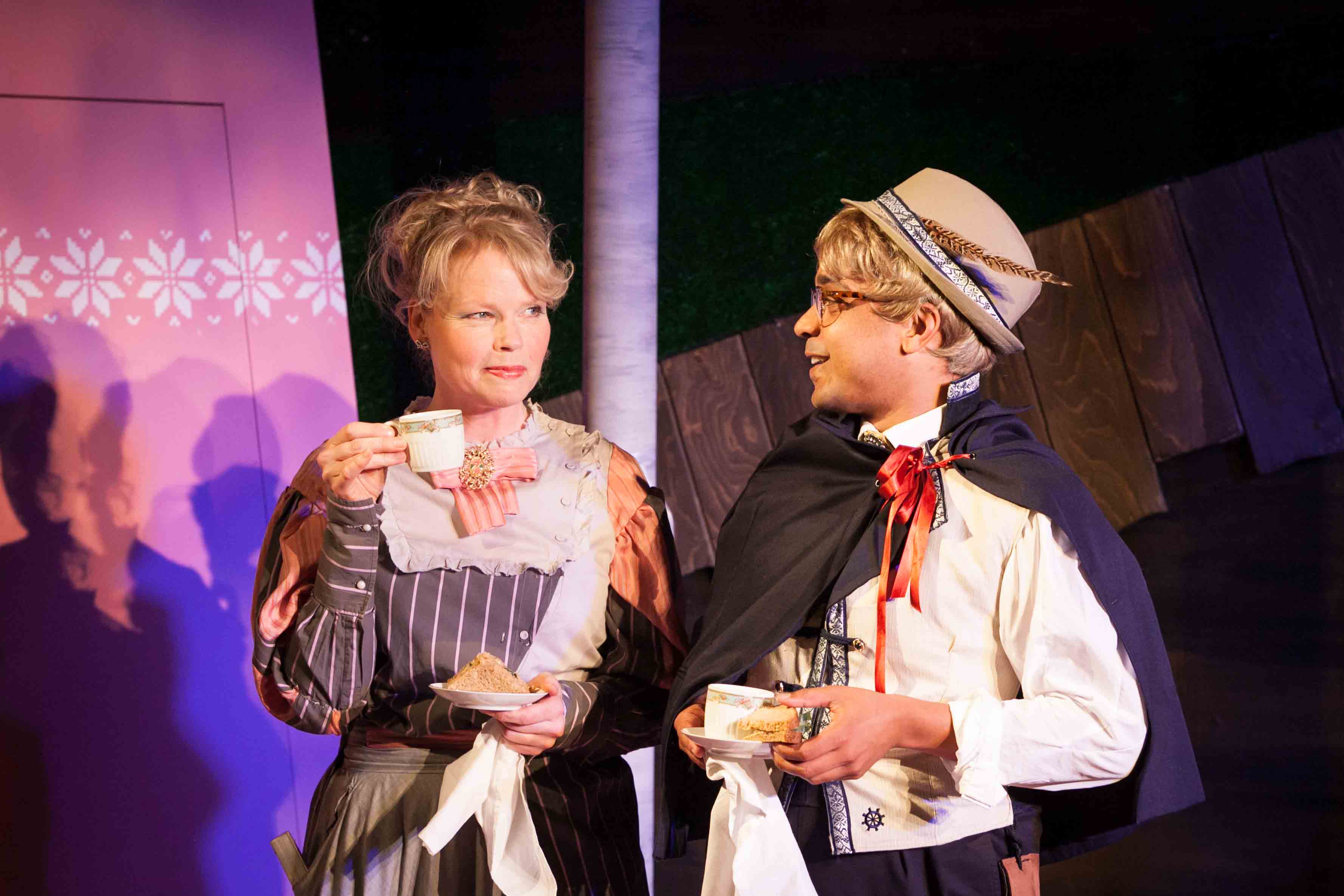 The tiny theatre is transformed into the exuberant Nordic cousin of Tolkein’s The Shire, all low wooden doorways in alarming pastel shades and bucolic rhapsody. In a nice touch, the goblins (whose mischievous spiking of the punch-bowl sets confusion in motion) lurk at the back of the stage, adding constant commentary in Luke Bateman’s attractively naïve musical accompaniment. Some dodgy poetry (and still dodgier West Country accents) completes their role as folk-styled agents provocateurs.
