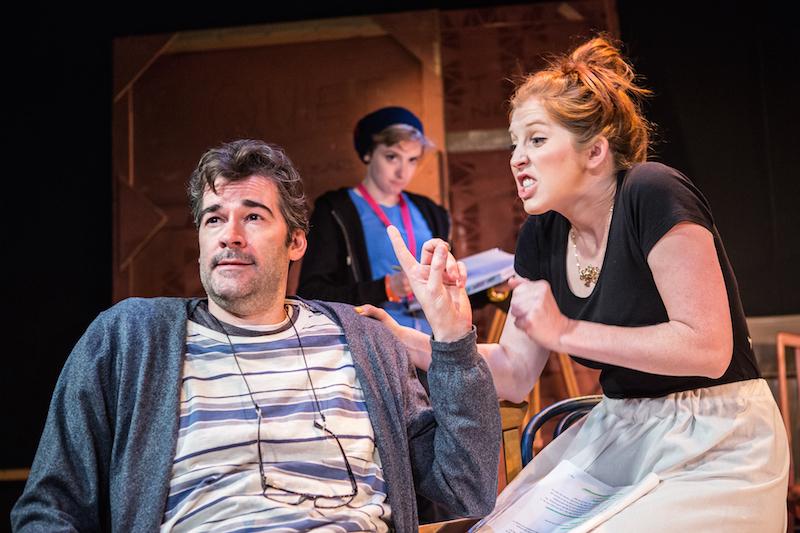 David Spicer offers slight variation on the form with an ever-evolving play-within-a-play. What begins as domestic drama centred on a tortured artist becomes, over multiple rewrites, a muddled attempt at taboo protest play called Banksy Ain’t Gay. The playwright never appears, but the ominous clacking of his keyboard between scenes signals another draft, upping the stress levels for inexperienced director Evelyn (Ben Starr), put-upon stage manager Chrissie (Charlie Cameron), and the increasingly mutinous cast: vain leading man Hugh (Adam Riches), his bitter ex Linda (Hannah Stokely), eager ingénue Gemma (Hatty Preston), befuddled veteran Walter (James Woolley, pictured below with Preston), and bewildered newcomer Kryston (Tosin Cole).