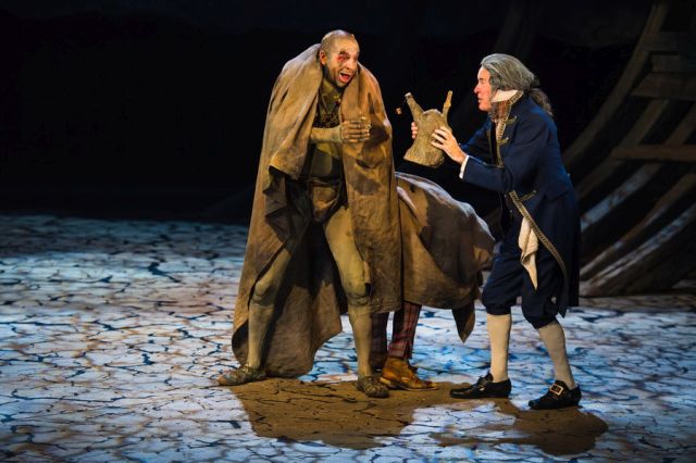 That said, this is also very much a play about being not of the spirit world but the mortal one. Prospero was displaced in Milan by a bunch of fellow-Italian nasties. His daughter Miranda (Jenny Rainsford, brilliantly flesh-and-blood, elegantly natural) falls instantly in love with the first young man she has seen, the tempest-borne Ferdinand – nicely self-ironised by Daniel Easton. Simon Trinder and James Hayes are vivid as the ship’s jester and sack-guzzler, Trinculo and Stephano, and the manner in which they agree to Prospero’s murder with Caliban – Joe Dixon (pictured above, with James Hayes) with horribly swollen belly and exposed backbone – is staged by Doran with greater gusto than the Italians’ flailing attempt to save themselves and return to power.