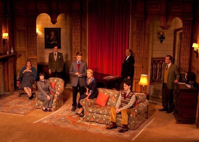 The solid set (complete with William Morris sofa and acres of wooden panelling) frames the action in a single space, helping to foster a sense of stylish entrapment. Much fun is had with the various doorways and staircases, and some of the evening’s best laughs come from the manipulation of theatrical exits and entrances.
