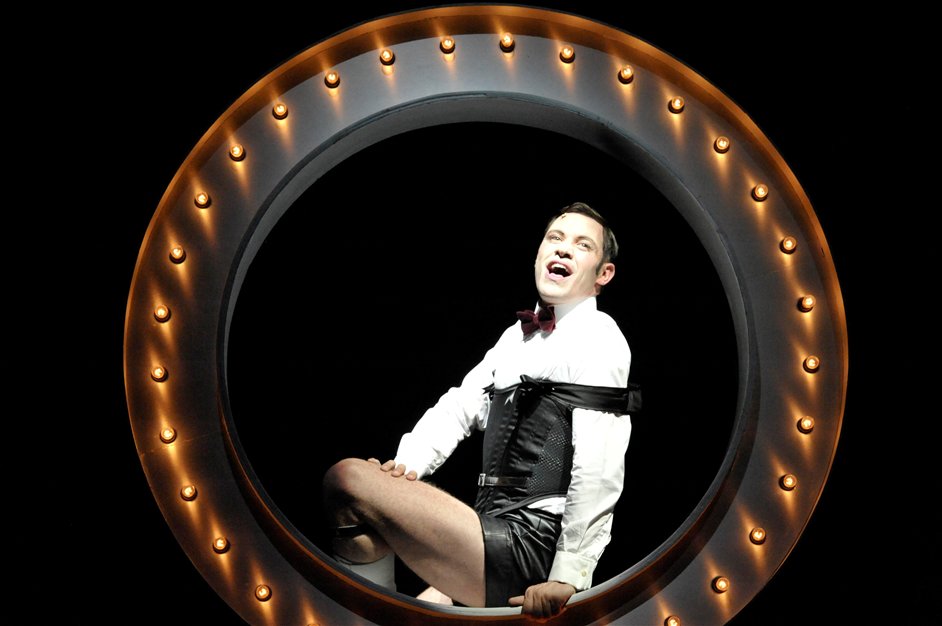 I’ve always assumed it was Hal. Joe Masteroff was already on board. Which came first, Hal or Joe, I’m really not sure. Then we started meeting regularly. This was what made it work. We met and we talked and we talked and we talked and we talked and we talked. What if somebody throws a rock through the window? What if Sally has an abortion? So that after all the weeks of talking – and this is the secret to a collaboration – we were all doing the same piece. And Fred and I were writing. We must have written, God, 60 songs. A lot of them were what we called Berlin songs. This was before the Master of Ceremonies (pictured below, Will Young as the Emcee) was clear in our heads. There were to be Berlinesque songs in between scenes and then it developed that we would have one character do them all. I began to listen to a lot of German vaudeville songs, German jazz of the Twenties, and Fred was getting very involved in German expressionist painting. The fact is we wrote a lot.