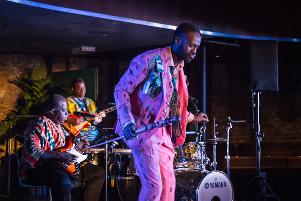Yet there is much to enjoy in Michael Longhurst’s fluid and panoramic production. An onstage band plays rumba, while a galaxy of some 35 characters offer different insights into Congo’s history (a quick five-minute lesson) and its politics. And its horror. In one flashback, there’s an enjoyable transformation scene and we witness Stef’s first traumatic trip to the Congo. There are lovely visual jokes; the surtitles use Lingala; the metaphor of the wound is powerful. Jon Bausor has designed an in-the-round staging, and all of the acting is first-rate, especially Richard Goulding’s Tony, Anne-Maria Nabirye’s Anne-Marie, plus Richie Campbell’s menacing Luis and Sule Rimi’s spirit-world victim of Congolese violence (pictured above). Despite this, the play is too long, too messy and its story lacks focus and genuine drama.