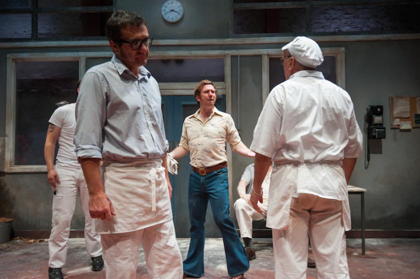 In this revival, Matthew Kelly (above, with John Wark) is excellent as the ponderous, shambling Walter - the old-timer who has worked at the plant since he was 14. Alone on the set at the play’s crisis point, he creates a mood of tense panic with just his wordless cries. His hefty performance contrasts well with that of John Wark, as Lance, the mysterious student in corduroy and posh brown brogues. The harsh overhead strip lighting makes his round face gleam as he ambushes other characters with wide-eyed, otherworldly monologues that baffle and enrage. We can never fully understand who Lance is or what he wants, but the play deliberately avoids inquiring too deeply. In Toast, as long as you’ve got work and some mates to do it with, you’re doing alright.