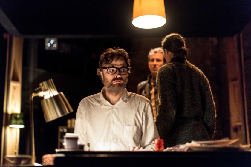 The action unfolds within a (mostly) rotating Hildegard Bechtler set that changes direction in the final act and that functions as a visual metaphor for Chekhov's peerless gift for viewing his personages in the round. And when the characters break the fourth wall to speak to us directly – a technique Chekhov employs in this more than any other play – the actors vault out of the frame and down to the front of the stalls to address the house as one. That same space is also utilised for the farewell scene when Hilton McRae's bruisingly dyspeptic Professor (pictured above, with Kirby behind) – a onetime aesthete gone terminally sour – departs with Elena for what is surely forever, leaving Johnny to clamber back up and into the visual wreck of a home where he and his adoring niece, Sonya (Jessica Brown Findlay, fresh from Icke's Oresteia) return to their accounts.