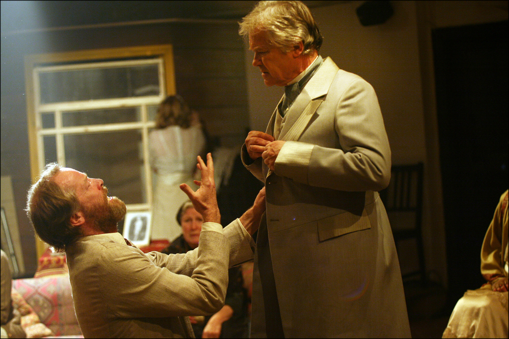 Casting Glen against type as the sardonic, shabby Vanya rather than the doctor proves inspired. Glen (looking like a grubbier Van Gogh, with battered beard and linen jacket) makes much of his character’s restlessness – sitting, speaking and gesturing with an urgency that only find its outlet in the cruelty of his humour. All bristles and emotional scabs, Glen’s Vanya rubs with delicious brutality against David Yelland’s Serebryakov (pictured below with Glen). In Poulton’s hands the professor’s dialogue is as smooth as his suits, and this elegant fraud (“scattering academic dust on the shelves of oblivion”) makes a fine villain.