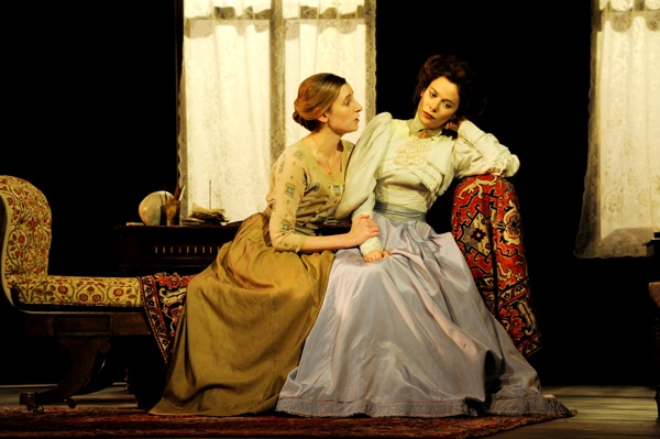 Samuel West’s Doctor Astrov, meanwhile, is a masterly collision of boyish enthusiasm and sour middle-aged disappointment. He looks, when he first appears, like a man suffering mental strain. His mouth works, his lips quiver, he blinks rapidly, yet he retains an elegance and a fervour for his ecological causes that entirely credibly enslaves Carmichael’s hungry-looking, almost cadaverous, hollow-cheeked Sonya (pictured above with Friel); later, alone with her and half-drunk, he stifles belches and slurs until she intimates her feelings for him, at which he brusquely shakes her hand and gracelessly dashes out. To Yelena, though, he declares, “You may eat me,” and down on his knees, bares his neck to her as though she were a vampire. Friel, for her part, sometimes props her hand on her hip almost as if that gesture alone were keeping her spine straight and her body upright. And after Vanya’s botched attempt to murder Serebryakov, he and Astrov sit together, helplessly and mirthlessly laughing and wiping their eyes, twin crumbling pillars of hopeless unhappiness. This is a household drained, physically and mentally, by boredom, frustration and deep discontent.