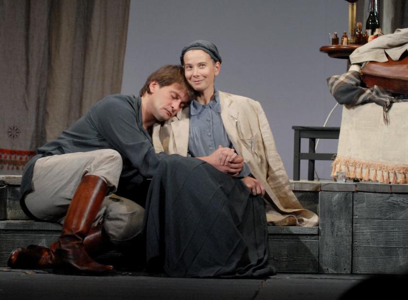 And there she is, headscarf off and locks flowing, as tragic, restless and consumptive Masha in Three Sisters, the frustration always lower key until the final despairing but silent clasping of Domogarov’s weak Vershinin, never as momentarily likeable as his Astrov and played with superb differentiation. Vdovina is vocally better as the awful wife of the sisters' beloved but feckless sibling Andrey (Alexey Grishin, as convincing in drunken nihilism as Vladas Bagdonas's catalytic Chebutykin), never shrieking, her banal inhumanity conveyed in almost throwaway high-handedness. And Derevyanko is better suited to the tenorial role of the decent but unloved Tuzenbach.