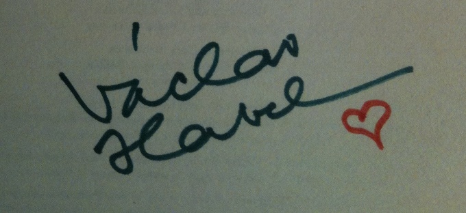 At the end of our converstion I proffered my copy of Living in Truth and asked President Havel if he would autograph it. He obligingly inscribed his name in round flowery letters with a thick blue felt tip, then produced from his inside pocket a red felt tip and, under his name, carefully drew a heart.