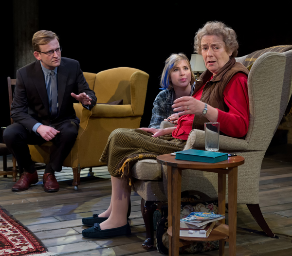 All this makes for a tender play, carefully directed by Alice Hamilton for the Up in Arms company. Her cast is superb: Linda Bassett (Edie) delicately performs her character’s sudden shifts from dwelling in the past to acute awareness of the present. Robin Soans is perfect as the grumpy Arthur, and together they are absolutely convincing as a long-married couple. Simon Muller as the awkward Stephen and Eleanor Wyld as the kind Kate are excellent too (both pictured above with Bassett). This is a moving evening, but the play’s meticulous naturalism sometimes sits uneasily with its poetic realism, and it lacks contemporary bite.