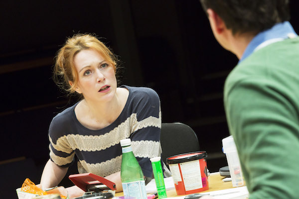 Still, over a continuous 110 minutes of uninterrupted stage time, the solid ensemble cast certainly hold our attention. Although not word perfect, Nicholas Le Prevost gives Rudolph a quiet kind of charisma which contrasts nicely with Laura Rogers (pictured above) and Dominic Rowan’s increasingly desperate couple. Kate Fahy and Milo Twomey are both equally convincing as Corinna and Konrad. Lizzie Clachan’s design allows the actors complete freedom to build a Christmas tree from the objects at hand, and the playwright’s jokes, a couple about Mein Kampf, elicit nervous laughter. It’s quite a fun evening, although for long stretches more like a radio play than a staged event. I just wish that the satire was more savage and the targets more relevant.