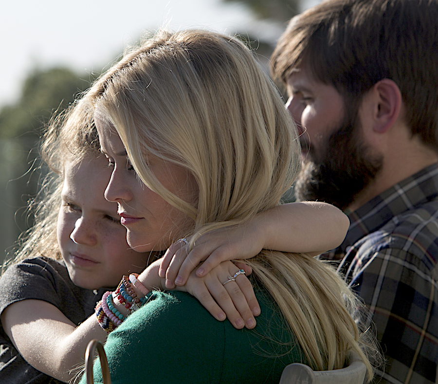 This opening episode kicked off as mothers (mostly basking in air-conditioned splendour inside stately SUVs) ferried their kids to school for the start of the new academic year. Far from being a commonplace occurrence, this was more like a parade of social status and hierarchical prestige. Queen bee among the local mothers is – or at least she thinks she is – Madeline Martha Mackenzie, played with neurotic energy and relentless pushiness by Witherspoon. She’s good friends with the quieter and more reflective Celeste Wright (Kidman), and has gathered up an instant new gal-pal in Jane Chapman (Shailene Woodley), a single mom newly arrived in town with her son Ziggy and feeling fragile and out of place (pictured below, Witherspoon with Darby Camp as daughter Chloe and Adam Scott as husband Ed).