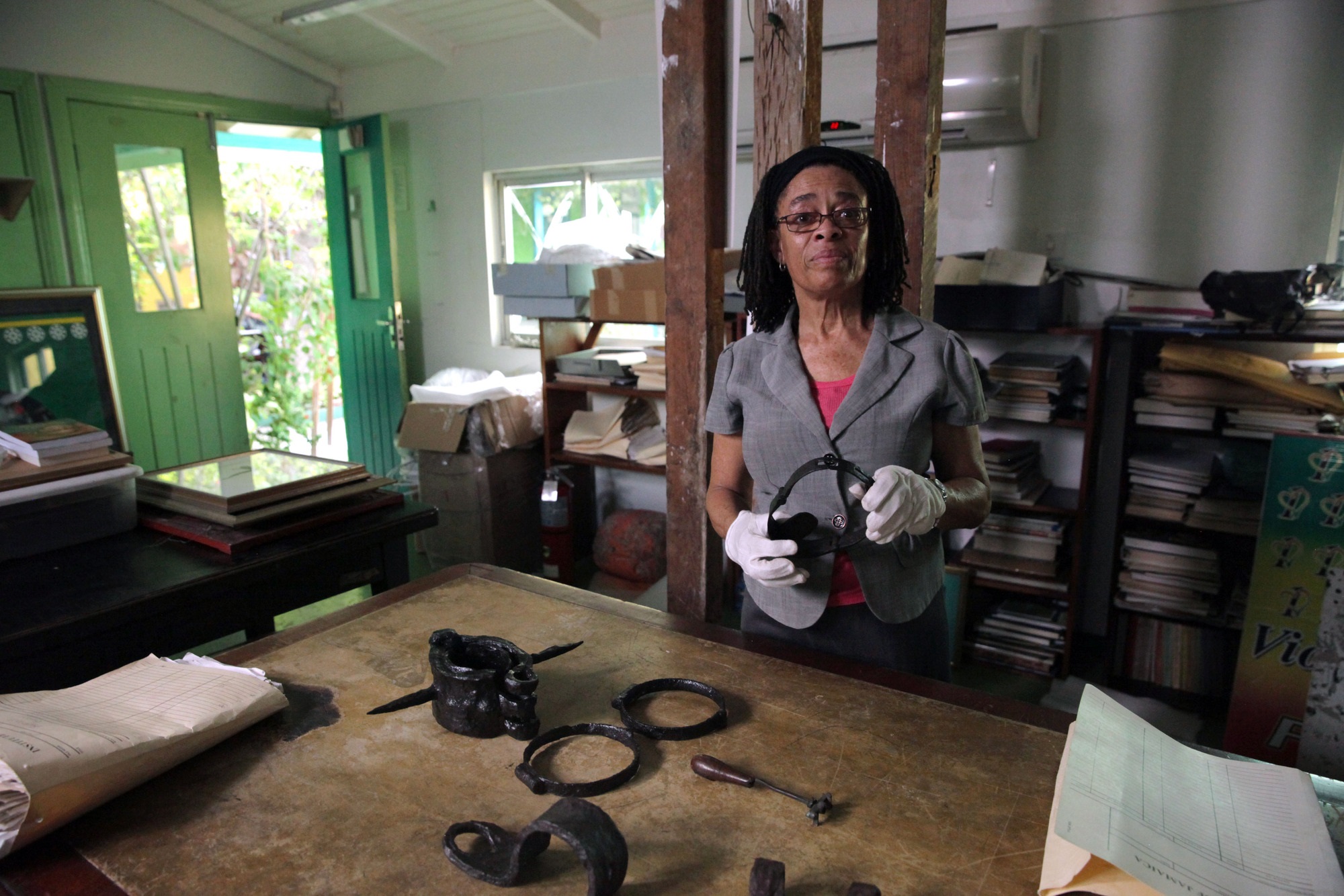 There were lots of numbers cited here, developing the programme’s basic thesis that people were property. Olusoga’s wider narrative was of how that awareness entered, and has remained in the history and consciousness of our society. In this first part, titled “Profit and Loss”, he took us through the backstory and some locations, his personal reflections interspersed with brief interviews with some of those involved in the UCL project, as well as experts on Caribbean history, and even descendants of slave-owners. His generally dispassionate tone broke only once, when he was being shown the instruments of restraint – torture might just be too laden a word, but the distinction is surely academic – that discouraged slaves from escape or resistance. (Archivist Lauris Codling at the Institute of Jamaica shows a variety of slave shackles and instruments of punishment, pictured above by Ben Crichton.)