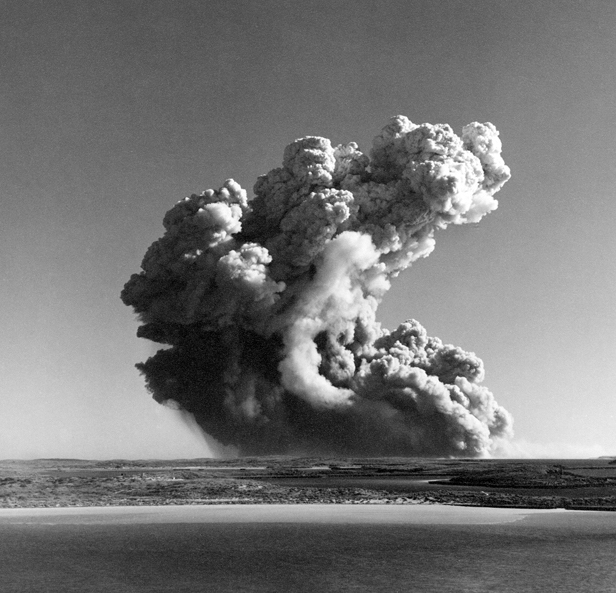 Rudy Peierls and Otto Frisch, Jewish scientists in Britain to escape the Nazis, produced the theoretical groundwork for creating a nuclear explosion using small amounts of uranium. Work on a British bomb proceeded under the “Tube Alloys” banner (based in Rhydymwyn in Wales), but rising costs, plus the fact that the Germans were making ominous progress with their own nuclear weapons, prompted Winston Churchill to agree to let the Americans take over the project, even though they’d been lagging behind the work done in Britain (atomic bomb test at Monte Bello islands, 1952, above).