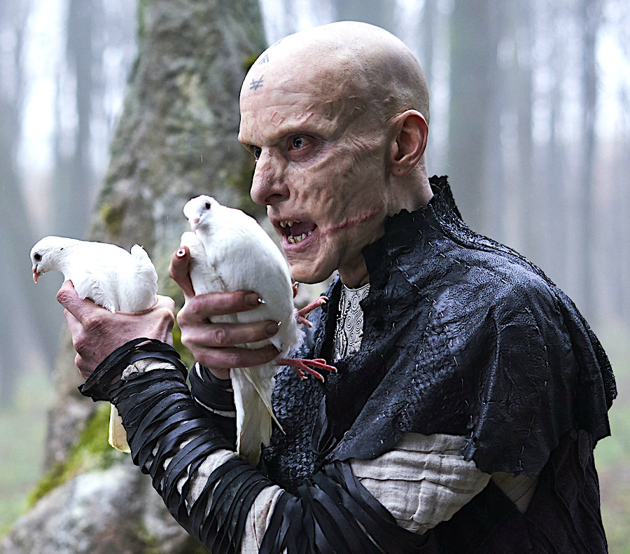 Meanwhile, outside the Roman camp, Zoe Wanamaker is back as Antedia, Queen of the Regni. She has been captured by a group of grunting low-lifes who have a corpse as a regular dinner-table guest, and has been chained up at the bottom of a well and forced to wear a wire mask. Happily, she’s going to dupe one of her very dim captors into putting toxic “moon trees” in their weasel stew, rendering them insensible so she can burn them alive in their home.