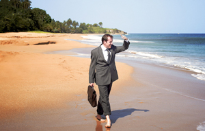Poole can't stand the Caribbean either, because the light's too bright, the sand is too sandy, and he feels the heat especially acutely because his luggage hasn't arrived and he's stuck with the suit he arrived in. Anybody else would at least remove their jacket and tie, but Poole is a bit of an oddball, a man seemingly with little in the way of a social life and no interests beyond investigating crimes. He yearns nostalgically for Croydon, dreams fondly of "finally being cold again" and longs for drizzle. He phones home to ask his neighbour about his dustbins (DI Poole on faraway beach, pictured below).