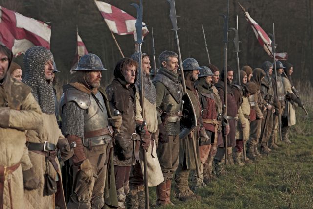 Sharrock comes at the play in an altogether different way, and not only because Ben Power's extensively cut (the Scroop/Grey subplot is gone), re-ordered adaptation frames events with the funeral of the warrior-king, Henry, who, we are reminded, died of dysentery in 1422, age 35. (Well, he at least outlasted poor ol' Richard II by two years.) The prevailing tone is evident from the slowly spoken, sepulchral sounds at the start of John Hurt, who plays a (mostly unseen) Chorus, only to make a fleetingly sad-eyed appearance at the very end. On stage, this character serves to invite us to open wide our imaginations; on screen, he's our shivery guide toward the grave, a destination that Henry and his entourage (pictured above) will come to know all too well. (He's also here presented as a witness to history via a cunning surprise that threads the character, if not Hurt himself, throughout the action.)