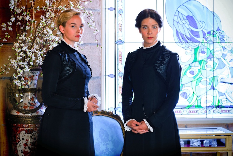 But Moray is certainly a ladies' man, as all the young female assistants swoon over him and we learned that he has had a relationship with one of them, Clara (Sonya Cassidy, right in picture with Vanderham). He's also a man with a past, as his first wife died “in an accident” - unexplained - and the spiteful Clara, who immediately saw Denise as a rival, knows something about it, which in a drunken moment she threatened to reveal. Hmmm.