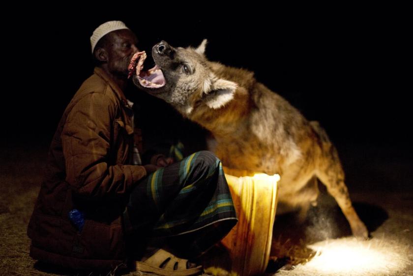 The most surprising was the spotted hyena, Africa’s most feared predator. Two packs of hyenas, each about 60 strong, battle it out nightly to see which can gain access through the city walls of Harar, in Ethiopia. The victors prowl through the dark streets to the city’s meat market, where the butchers use them as extremely efficient waste disposal, throwing to them bones that cannot be sold, but which can be crunched by the powerful jaws of these amazing carnivores. Moreover, there is one special family that for five generations has been feeding them – by hand, no less – even more succulent titbits of meat, as a way of appeasing the night spirits that might harm the human population. Tame hyenas, which could easily overpower and consume a human child, come when called and accept the delicious offerings. And by day they are gone, back to the forest whence they came. This symbiotic relationship between wild animals and the human population has evidently been going on for centuries there.