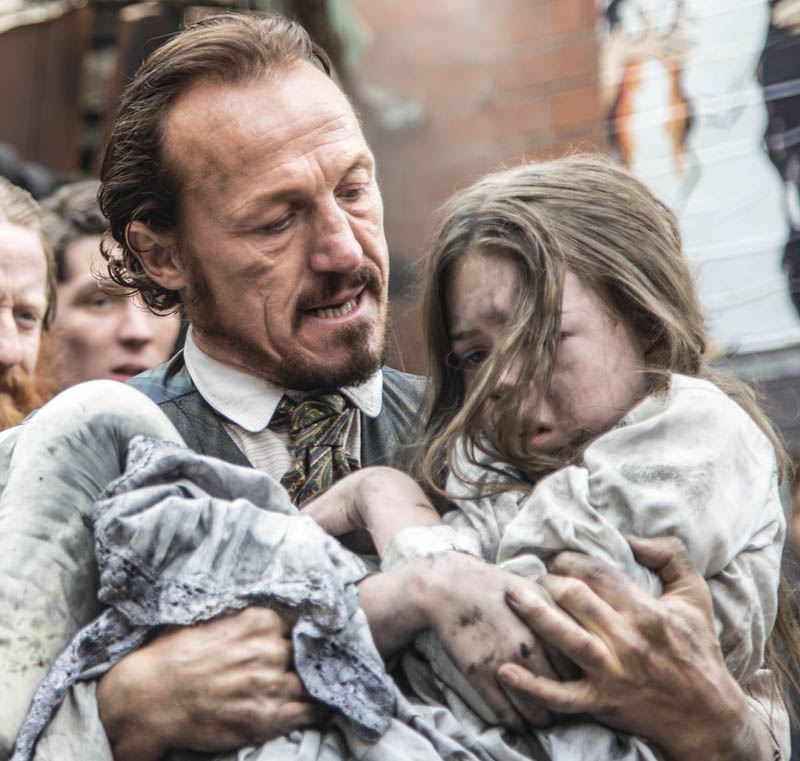 Happily, the change of address has done Ripper Street no harm at all, and this powerful opener centred on a train robbery gone wrong in London's East End. Masked hijackers set out to steal a wad of US dollar bearer bonds being transported on the Bishopsgate goods line, but owing to bad luck and misinformation ended up causing a gruesome train crash on the Leman Street bridge. Fortuitously, this was a stone's throw from the police station where DI Edmund Reid (Matthew Macfadyen) was based. More fortuitously still, Reid's old comrade Bennet Drake (Jerome Flynn) happened to be travelling on the stricken train, though was unhurt. In addition, pioneering medic Captain Homer Jackson (Adam Rothenberg) just happened to be in the neighbourhood (below, Jerome Flynn rescues accident victim).
