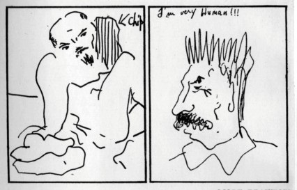 Storyville: Toffs, Queers and TraitorsThere were many, of course, even from his gilded youth, for whom Burgess was more insufferable than insouciant (some of his attributes, like the filthy fingernails that everyone seems to have noticed, didn’t get a mention here). The contradiction was there in the two lyrics that ran through Toffs, Queers and Traitors: one was Nat King Cole’s “Unforgettable”, the other Alan Price's “I’m a gambler”. Was risk the key to Burgess’s character? He was a gifted caricaturist, and it’s hard not to admire somehow the sheer chutzpah of someone who added texts to his cartoon sketches of the Soviet great leaders (pictured above): Lenin gets the word “Chip” next to an arrow pointing at his shoulder, while a grizzly-looking Stalin has the caption, “I'm very Human!!!". (They were found in his London flat after he had flown the country.)