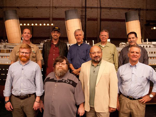 Cameron (pictured left in middle of back row), leading his troops like an irascible wartime admiral, was determined that their conclusions would be unhampered by historical baggage. "What is history?" he demanded. "History is this kind of consensus hallucination." Whether Jim & co successfully lifted the delusional fog from Titanic's final plunge remains moot - some of his technical conclusions must be speculation, despite the monsoon of digital analysis he has hosed over the case - but the passionate commitment of his team was extraordinary. Ken Marschall, a "visual historian", has been painting pictures of Titanic since 1967, and recalling the shock at seeing the mangled state of the once-beautiful vessel still moves him to tears. Similarly, researcher Bill Sauder sobbed as he recalled opening a perfume bottle retrieved from the wreck, and how its still-fresh smell momentarily banished the reek of death emanating from other Titanic artefacts in his laboratory.