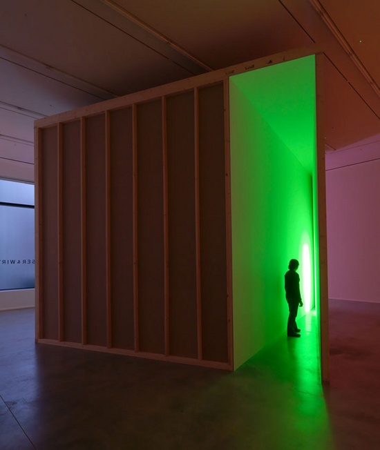 The first structure we’re confronted with is the massive Untitled (Helman Gallery Parallelogram, 1971 (pictured right): two narrow, tapering green-lit passageways lead to a pallid green-lit room. This environment bonds the perceptual and the physical though its optical trickery in the use of light. It supposedly represents the body-focused aspect of Nauman’s work, but there’s a cerebral element too; there’s no attempt to disguise the structure of the freestanding work. To walk around the wooden walls gives the work a knowing transparency.