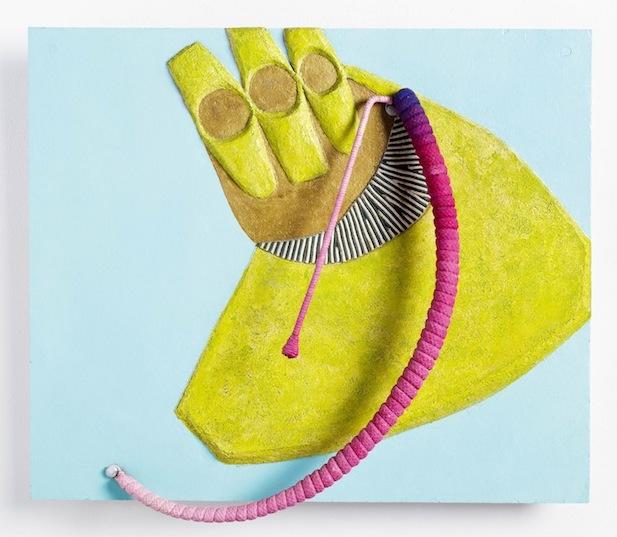 The first four untitled paintings have a mural-like quality. They are compartmentalised into zones bearing sometimes interconnected objects that are neither figurative nor fully abstract. Resembling body parts, vessels, or tools, they feel part-realised and suspended on the surface in a state of becoming. The work echoes the senseless anthropomorphic machines of Marcel Duchamp and Max Ernst. Sometimes sticking materials to her surfaces, mostly woven cords to add texture that are then painted over, the colour scheme is of whites, greys and a distinctive yolk with black delineation.
