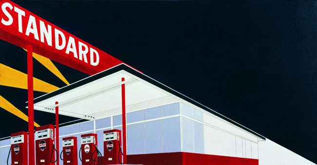 By 1966, Ruscha had hit on his best-known image, Standard Gas Station (pictured above), the building squeezed into a narrow diagonal perspective that has become in effect the artist's own logo; the word "Standard", both a brand name and a gnomic text in its own right.