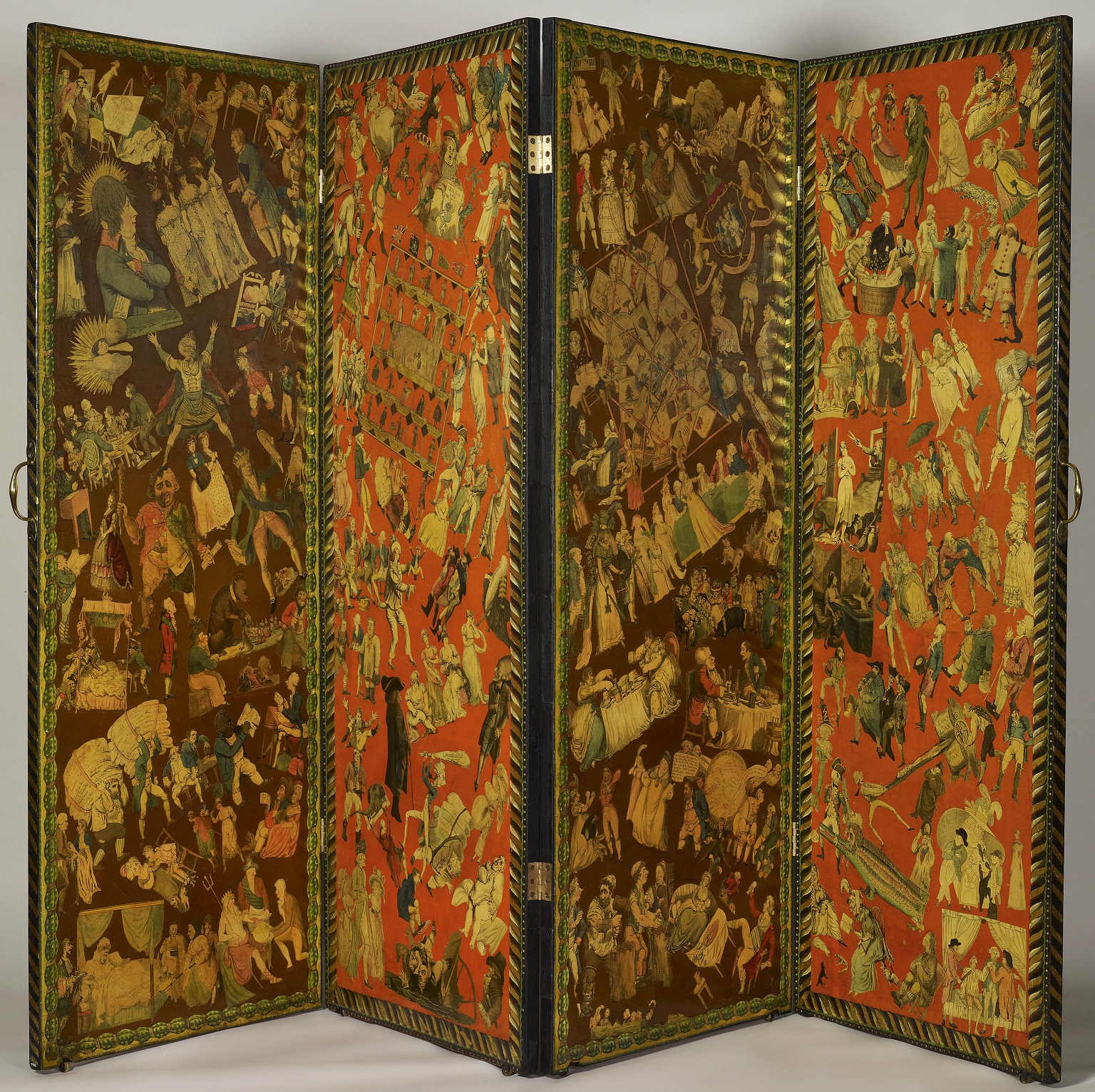 Rowlandson had a sophisticated education, including six years at the newly-founded Royal Academy Schools. His gift for draughtsmanship, his clever and rapid response to political and social events, and his lucrative connections with print publishers, imprinted his view of blowsy, self-indulgent men and women – characteristically exaggerated, either obese or emaciated – on the chattering classes, the literati glitterati of the day. Each image can be and is dissected in terms of a wealth of sources and allusions in this detailed exhibition. The upper classes collected the very images that lampooned them – the parallel today might be the readership of Private Eye: they were kept in portfolios, or mounted and hung in print rooms, and even made into so-called decorative scrap screens, of which there is an example in the show (pictured above).