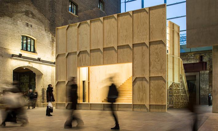 Named after a temporary film studio used by Thomas Edison, which revolved towards the sun – an image that seems to Wentworth "very connected with looking and seeing" – Black Maria looks like a theatre, twisted and turned in on itself, executed in unprimed timber and plywood. It appears at once festive, provisional and balsawood-fragile, framed against the massively solid surrounding building.
