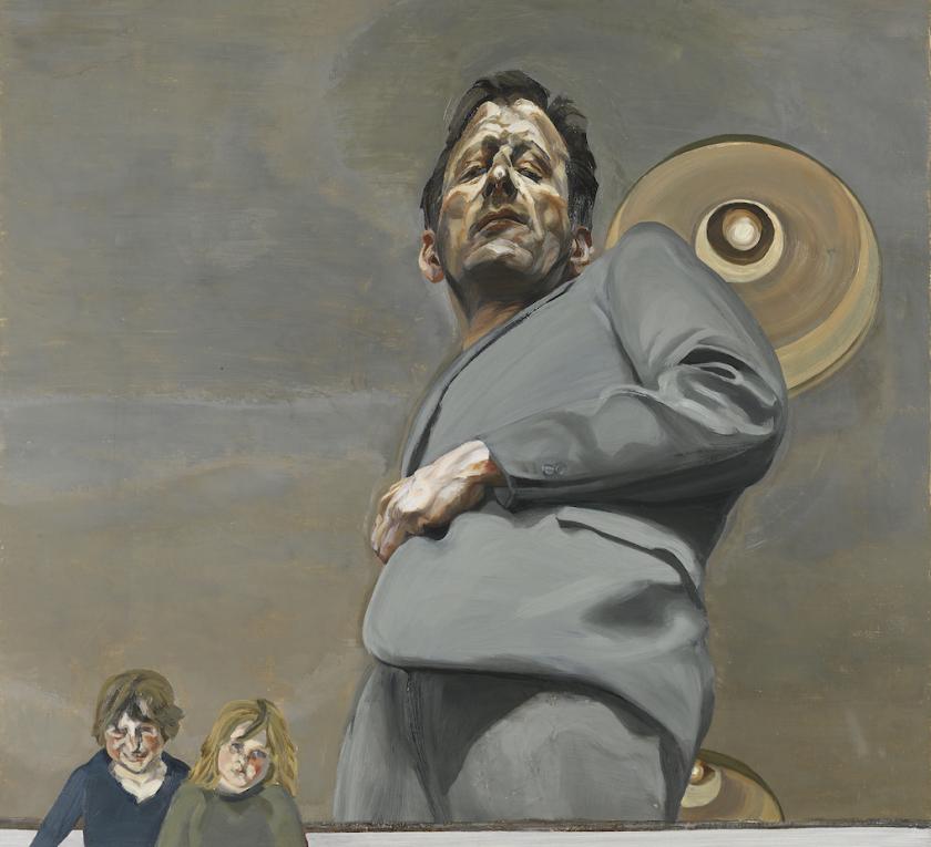 And he likes to complicate the relationship between artist and sitter in unexpected ways. As though to make things seem unstable, in Two Men, 1988 he tilts up the picture plane to the point where the couple on the bed look as if they are sliding down a lift shaft. Look again at Reflection with Two Children (Self-portrait) (main picture) and you realise the kids are not standing beside the artist but are in front of a large self-portrait; the artist is not staring at us, but peering down at his own reflection. He is both in the picture and outside it at the same time.