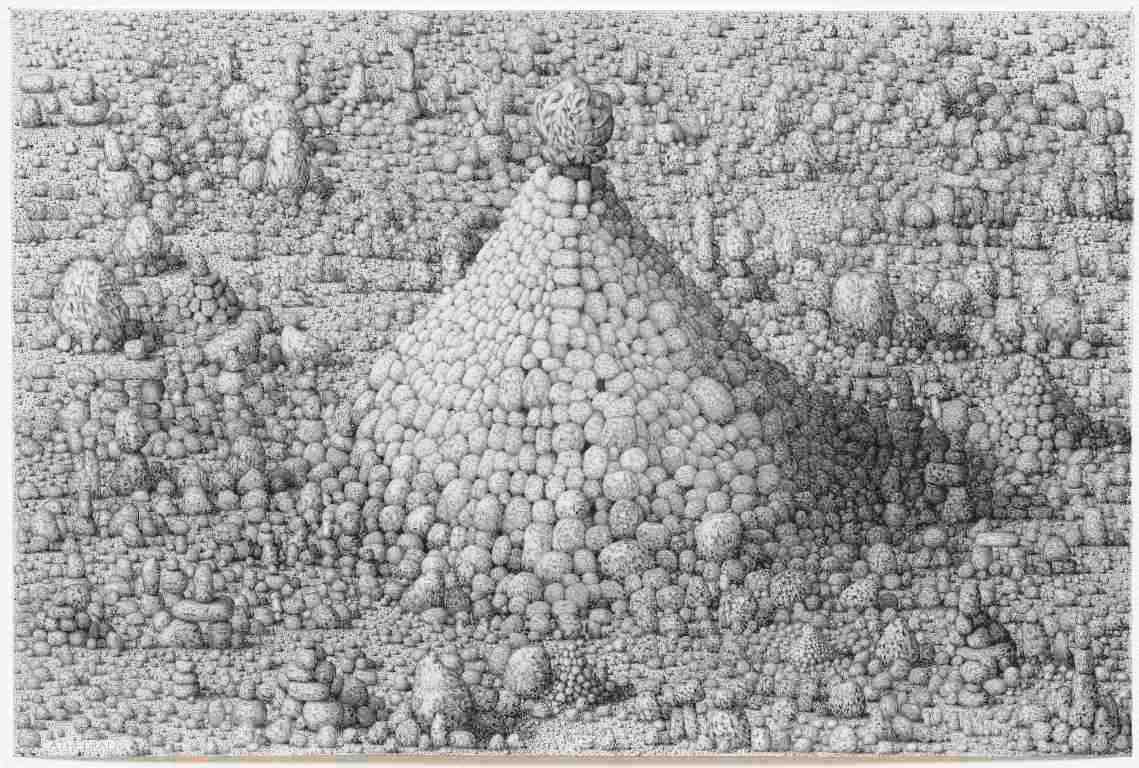 Genesis it truly is, for the drawings take the words from the Bible, and illustrate them with Noble’s characteristic little turd-shaped men, producing a Newtown creation-myth as they form their world. The last drawing of the series urges us (them?) to "be fruitful and multiply", and with that we pass through a beaded curtain, the physical manifestation of the beads that appear in so many of Noble’s drawings, into the main gallery, to be faced with two huge pink marble turd sculptures set on plinths, which both guard and announce the show's focal point, a seven-metre-wide drawing of Nobson’s park.