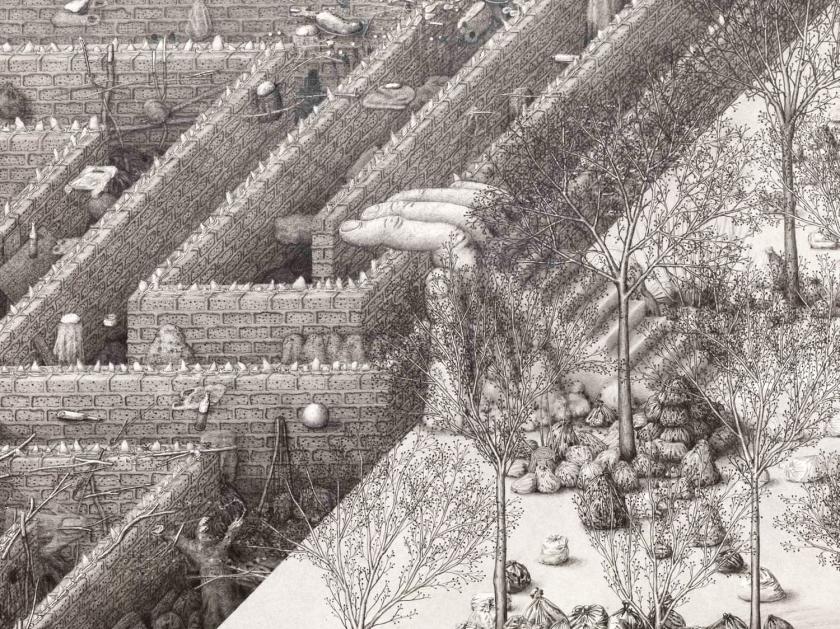 Noble takes a high, cartographic-like viewpoint, similar to those used in medieval maps which promised that dragons lurked at the ends of the known universe. From this vantage point, the omniscient artist looks down on his creation, and finds it, un-biblically, not good, but instead filled with waste, both obvious (his little turd men) and more occluded - in this case, in the main image, endless rubbish sacks.