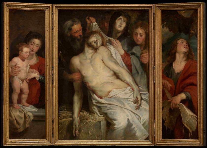 The result is a devastating piece of storytelling, with the cluster of figures around the dead Christ closely framed to draw us in, to involve us in their grief. The Virgin and Child on the left form a visual counterweight to the Lamentation of the main panel, and while the contrast between the rosy maid with her plump little baby and the ghastly pallor of the Virgin tending to her dead son is chilling, more so is the visual conceit that allows the infant Christ to contemplate his own death.
