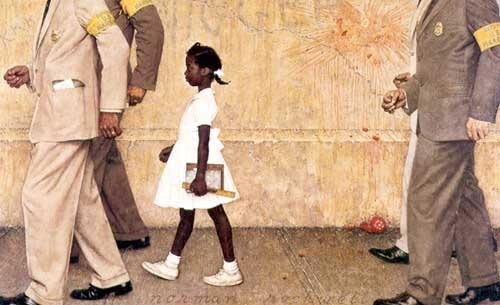 As the Fort Lauderdale museum curves to the right, one confronts in the second room of the exhibition the vast expanse of Post covers, only the lowest of which can be scrutinised. These include his portraits of John Kennedy, Nixon, Nehru, and Nasser, technically skilled works of realism that are forgettable alongside the downhome Rockwell. Among the last anecdotal covers was 1960’s Triple Self-Portrait (pictured left; the original painting is also here), Rockwell’s most self-conscious piece. Seen from behind, Rockwell sits at his easel at the moment he is about to start painting a confident Bing Crosby-like portrait he has drawn of himself smoking his pipe, without spectacles. But the face of the painter reflected in the adjacent mirror is that of an uncertain, perhaps anxious man whose eyes cannot be seen behind his glasses. According to the American Chronicles catalogue, Rockwell’s mirror was opposite a large window and his glasses would have reflected the glare of the sun, but the absence of his eyes reinforces the idea that he is not painting what he or we are seeing in reality; the small self-portraits of Dürer, Rembrandt, Picasso and Van Gogh that he has tacked to the top right of his canvas are reminders that painters see with more than their eyes. The painting, which refutes the notion that Rockwell’s paintings can be understood at one quick glance, brilliantly deconstructs the artistic process of composition even as it confounds the notion of realism.Opposite the array of Post covers is Murder in Mississippi (1965), and a supporting display of notes, photographs and newspaper articles showing how Rockwell came to paint his impression of the nighttime murders of the Civil Rights workers Michael Schwerner, Andrew Goodman, and James Chaney by Klansmen in Philadelphia, Mississippi on 21 June, 1964. During his long tenure at the Post, Rockwell had been forbidden from painting black people except in service industry professions. Stirred by the Civil Rights movement and aware his work was overtly WASPish, Rockwell sought to redress the balance once he parted company with the Post in 1963.
