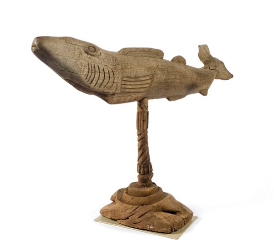 The route into art via religion is very common in Southern Africa. One of the most famous proponents in this "prophet/artist" mould is Jackson Hlungwani, a completely untrained man who, with his sons, began carving eight foot wood characters from the bible which stood in his garden. These attracted audiences, to whom he preached, performed healing rites and ran bible classes. The Altar of God is a depiction of the disciples (pictured above left, Jonah's Fish, from the Altar of God series), and is part of an extensive shrine called The New Jerusalem created in the late 1970s to mid-1980s. Before it was moved to the Wits Museum it stood outside, miles from any large town, in his rural village in Mbokhoto, near Elim in Limpopo Province.